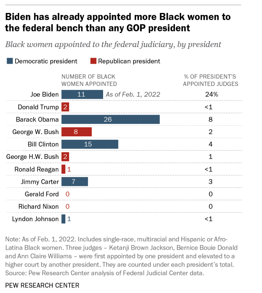 Gbemende Johnson, Why aren’t there more Black female judges on the federal bench?, Washington Post, February 22, 2022, available at https://www.washingtonpost.com/politics/2022/02/22/biden-black-woman-supreme-court/.; see also Statistics from the Federal Judicial Center – the education and research agency of the Federal Courts, available at https://www.fjc.gov/history/judges/search/advanced-search